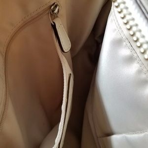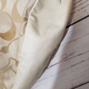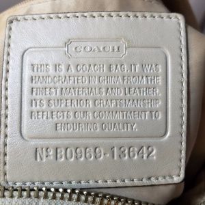 Excellent pre-owned condition. Slight scuff on the bottom of the bag as shown in the picture. Interior is clean with no damages. No wear on any of the leather. Colors are White, cream, and khaki. Style No. B0969-13642. Measures 12x14x2" with an 12" strap drop.