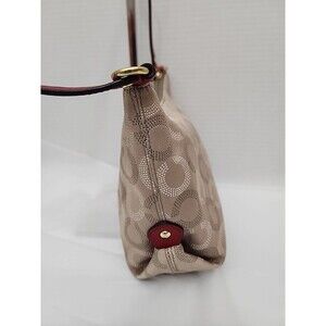 This Coach Ashley crossbody swingpack is a unique piece of art that will complement any outfit. The bag features a beautiful khaki jacquard fabric with cherry red leather accents and a gold-plated zipper closure. The bag has a semi-circular shape and measures 9 inches in width, 6 inches in height, and 4 inches in depth.