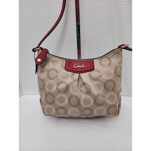 COACH ASHLEY DOTTED OP ART KHAKI JACQUARD CHERRY RED LEATHER CROSSBODY SWINGPACK
