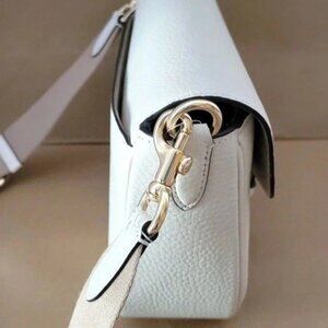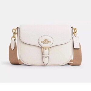 The COACH Amelia Saddle Bag Shoulder Bag in Chalk is a stylish and practical accessory for women. Made of soft pebble leather with a solid pattern and gold hardware accents, this small shoulder bag features a magnetic closure and a tan fabric handle/strap. Perfect for travel or casual occasions, this bag has a timeless design from the iconic Coach brand, making it a versatile addition to any wardrobe.