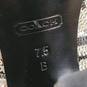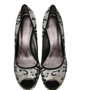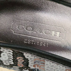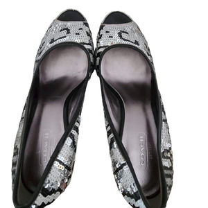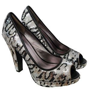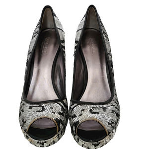 COACH Ashley Sequined Animal Print Open Toe Platform Pumps Silver Black White Women's Size 7.5B