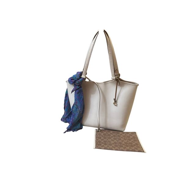 Authentic Coach City Tote featuring Signature coated canvas and white pebbled leather. Large open tote design with snap tabs and includes a removable zip pouch with wrist strap.