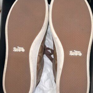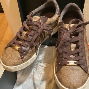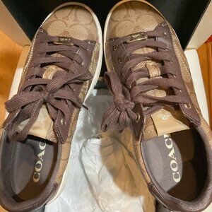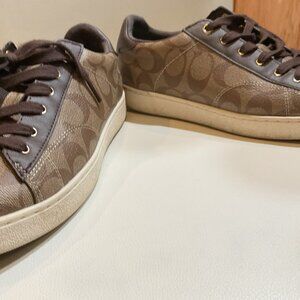 Authentic gently used Coach C126 low-top, lace-up closure, round toe sneakers in khaki and mahogany in signature coated canvas monogram design in original box.
