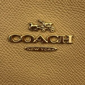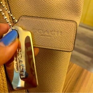 * Gold-toned hardware, including rings and a Coach logo tag.