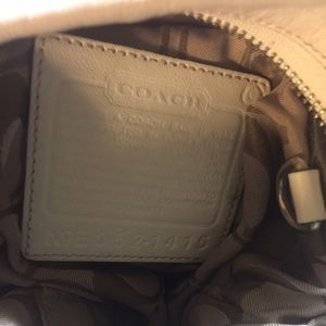 This Coach # 1415 style leather bag is gently used and from a smoke free home. Drop is 22" and the bag is medium size approximately 11" x 11" (outside measurement; Color is off-white or light beige. Very minor wear, if any and in good pre-owned condition.