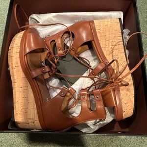 COACH BARKLEY SEMI MATTE CALF SADDLE COLOR LACE-UP WEDGE SANDAL SIZE 8 New.