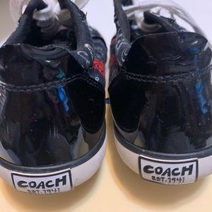 COACH BARRETT SZ 6B SNEAKERS BLACK WITH TED SND WHITE COLORS DESCRIBES AS BARRETT. PATENT LEATHER ON TRIP ON HEELS. PREOWNED . VERY GOOD CONDITION. .