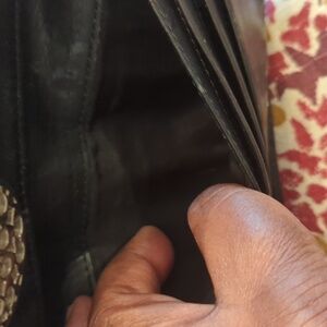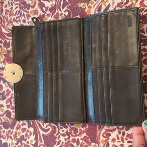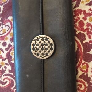 Black leather billfold with signature "C" design on snap closure. Has 12 card slots and 3 bill pockets. Backside has zippered change pocket. Billfold is in fair to good condition. Lots of life left. ☺️