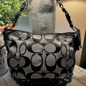 Chic Coach shoulder bag in a classic monochrome design. Features signature pattern for a stylish look. No callouts. Clean. EUC.
