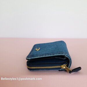 BRAND NEW WITH TAGS. Deep Blue color. A small sized Billfold wallet with snap-closure is perfect to keep your small essentials secure. Crafted of Denim and refined calf smooth leather. Features an exterior zip-around card or coin compartment for added convenience. Finished with a C logo at front.