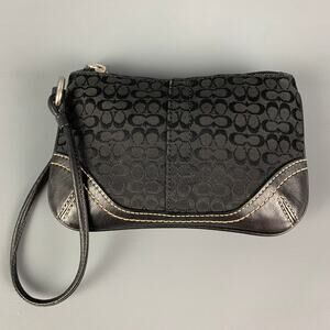 COACH wristlet comes in a black logo nylon featuring a leather trim, detachable strap, and a zipper closure.
