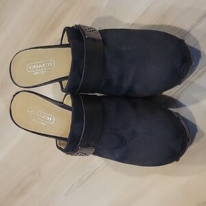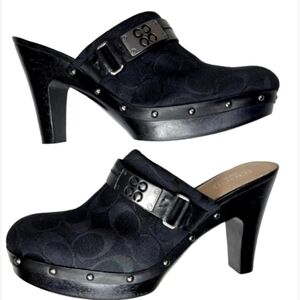 COACH Black Ivy C Signature Logo Fabric Clogs Mules Wooden Heels 7.