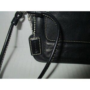 COACH Black Leather Clutch Wristlet Zip Top Turn Key Pocket Closure. 7.75"L x 4"H. Signature chain tag. Contrast stitching, buttery soft leather. Silver hardware. All measurements are approximate. Very good condition. Please see photos for more details. 0225 (ACC25-01)