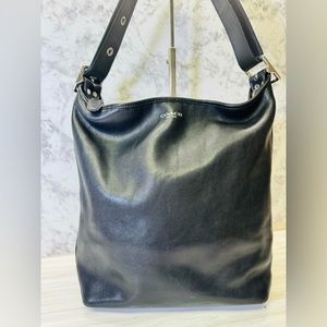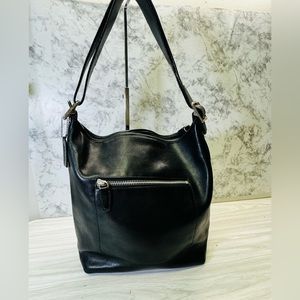This COACH Legacy Hobo Handbag in black leather is a versatile addition to your collection. The trapezoid shape, glazed finish, and silver hardware give it a timeless look suitable for travel, casual outings, workwear, or business. The bag features a zip closure, cotton lining, and multiple pockets for storage.