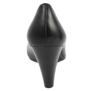 Coach black burnished leather 'Tatiana' peep toe pumps with strap & buckle detail. Stacked tapered heel. Style: Q1041.