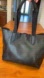 Sleek black leather handbag by Coach. Ideal for versatile styling. This unstructured tote bag is perfect for everyday use. The bag has a magnetic closure and mixed media straps with pebbled leather detailing. The inside of the bag has a pocket with zipper closure. The inside of the bag is a beautiful raisin color. The bag can be worn on the shoulder or the crook of the arm. The approximate dimensions of the bag are:
