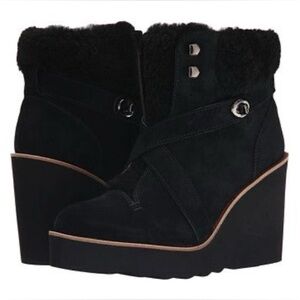 The Kenna Bootie combines the luxury of plush shearling with the sportiness of a roller-bottom wedge in a hand-finished statement design. A crisscross strap secured with an iconic Coach turnlock finishes it with signature style. Suede with shearling. 3 3/4" heel. Size 9.5B.