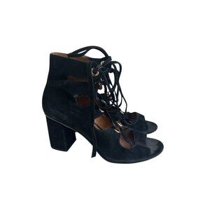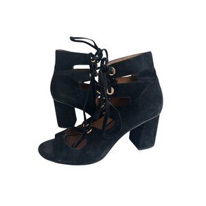 Elevate your style with these elegant COACH black suede block heels. Featuring a chic lace-up design, these size 8.5 heels offer comfort and sophistication for any occasion. Perfect for dressing up or adding flair to your everyday look. 3" heel