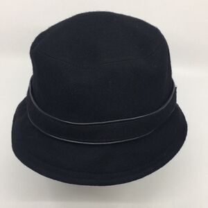 Coach Black wool bucket hat with what appears to be a faux leather piping and a silver tone turnlock, which is decorative (not functional turnlock, decorative only). Size P/S . In excellent preloved condition. Interior circumference is approximately 23”.