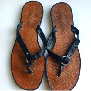 Stylish flip flop sandals with black straps and brown soles. Perfect for casual wear.