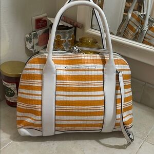 Stylish and versatile, this Coach bag features a striking white and orange striped design. Perfect for any occasion, it combines elegance with functionality. Comes with duster bag.