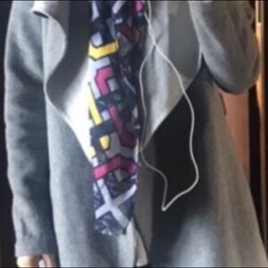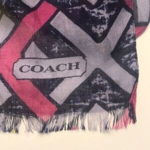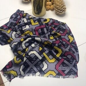 Coach scarf. Multicolored. Blue, purple/ magenta, yellow and white. Gorgeous colors in linked chain like print design. “Unfinished” ends. EUC.