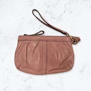 COACH Blush Pink Genuine Leather Wristlet. Soft leather with pleated front & back. Gold hardware with a detachable wrist strap. Zippered top closure with an interior slip pocket. Colorful fabric plaid interior with no stains or wear/tear. Exterior has a slight watermark in the front of the bag (as pictured). A tiny blemish on the back of the bag closer to the center stiching (as pictured).