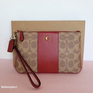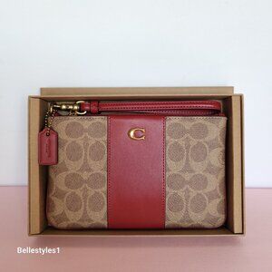 COACH Boxed Small Wristlet in Signature Canvas & Smooth Leather-Tan/Ruby color🎈