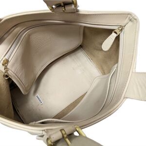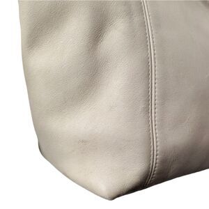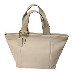 COACH Bucket Soho Rare Cream Waverly Vintage Buckle Leather Tote Bag Gently Used Moderate exterior scuffs/marks Minor wear to handles One scratch (photo) Minor interior lining wear Coach Motto; the scars, scratches, veins and wrinkles are natural marking characteristics of full grain leather. Interior; a few faint marks. Overall in good vintage condition. I have not tried to clean, marks could come out. Cream flexible leather. Goldtone hardware. Handle drop 5 1/2''.