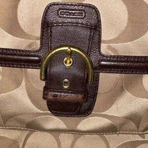 Excellent Preowned condition. Coach Jacquard Signature khaki/Tan Sateen with Dark Mahogany Leather trim and brass hardware ~ like new with exception of 1 small stain on right corner ~ see pic