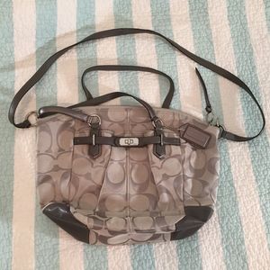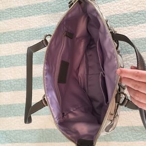 Short straps are a metallic. Lilac color liner with inside zipper pouch and two inside pockets