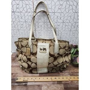 This is a COACH Chelsea tote bag in a large size with a signature striped pattern in beige. It features a zip closure, beige leather handles, silver hardware, and a purple fabric lining. The bag includes a bag charm and is part of the Coach Chelsea product line, making it a designer piece.