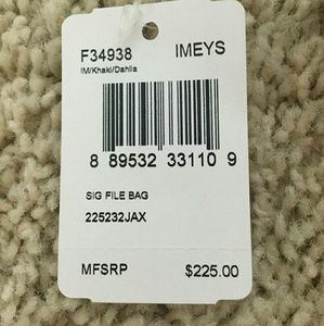 Light and dark brown with pink trim. 12x10 inch. Has inside and outside pockets. New condition (never worn, tags attached).