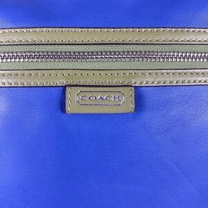 #0191 Coach brand, Daisy style, serial #23903 , satin fabric blue lining, beautiful blue and green leather made, NOTE: No HANGTAGS included or Purse SHARMS just for decoration.. Please look all the pictures for light stains, Sold As Is, cleaning out my closet. Approximately measurements: H 11.5 W 15” D 4.5”.