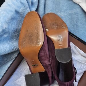 Step out in style with these elegant purple suede ankle boots. Perfect for any occasion, these boots offer both comfort and sophistication. only flaw is a scrape on inner heels (see photos) otherwise they're like new