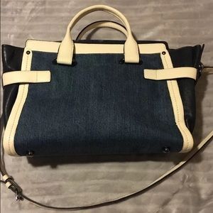 Coach blue denim with cream white boarding. New without tag. Has one small area in front as shown in pic. Very cute purse. :)