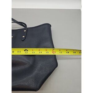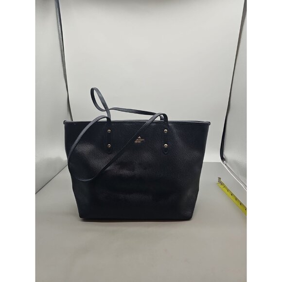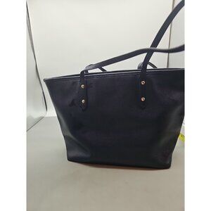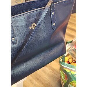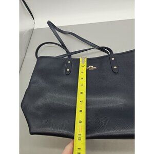 The COACH Dark Blue Leather Tote Bag is a stylish and spacious handbag designed for women. Made from high-quality leather, this tote features a classic design with a zip closure and inner pockets for added functionality. The large size and dark blue exterior color make it a versatile accessory that can easily elevate any outfit. Perfect for everyday use, this handbag combines fashion and practicality in a timeless and elegant style.