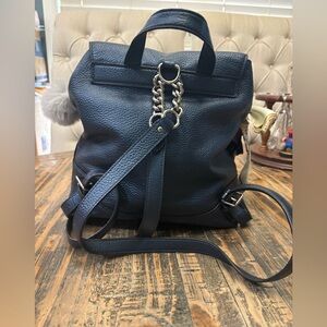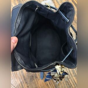 EUC - Refined pebble leather, Inside zip and multifunction pockets, Drawstring and magnetic snap closures, fabric lining, Top handle with 3 1/4" drop Adjustable shoulder straps. Measures 9 3/4" (L) x 10 3/4" (H) x 3 1/4" (W). A added dust bag included .