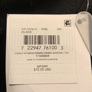 Add a touch of style to your wardrobe with this brand new retail for $75 Coach Embroidered Women's Baseball Hat in Black. Made of 100% cotton, this hat features an adjustable strap for a comfortable fit. The hat is black in color with the Coach logo embroidered on the front, adding a stylish accent to any outfit.