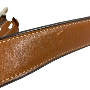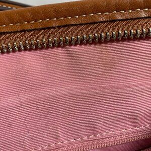 Suede has severe fading. Below the top leather trim on the jacquard, there's a faint discoloration. Interior is ok clean with a faint staining near top and bottom. Width: 10", Height: 11", Depth: 1", Strap drop: 9-19".