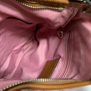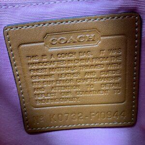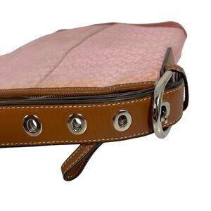This Vintage Y2K Coach F10944 bag features a signature monogram jacquard design with a suede bottom in a charming pink hue. Perfect for adding a pop of color and style to any outfit.