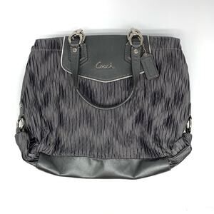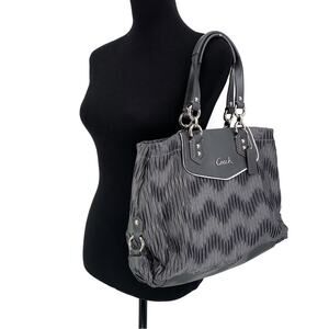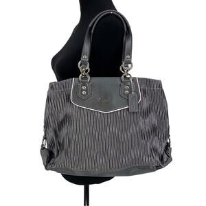 Coach Ashley Gathered Satin Carryall Satchel Purse in a medium grey. Over the arm straps, doesn't fit well on the shoulder. Gathered fabric exterior with a chevron shadow design. Leather trim, hang tag included, silver metal hardware. Two compartment openings with snap closure, zipper middle pocket for something flat. Very clean interior. Great condition!