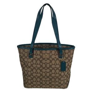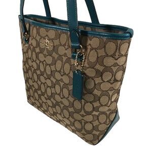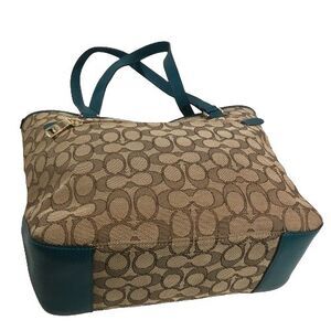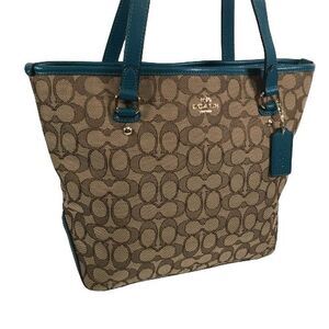 COACH F55364 Tote Bag Khaki & Atlantic Blue Signature Logo Canvas Leather Zip