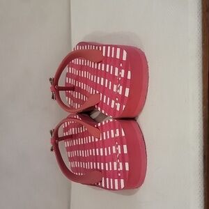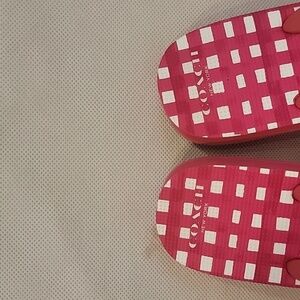 Coach rubber flip flops/sandals (sz 7-8). The flip flops are dark pink & white. They have a metal silver bow. They are in excellent condition.
