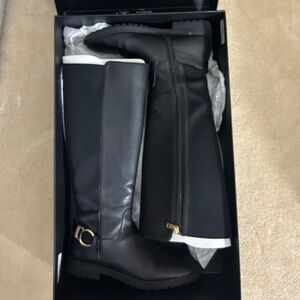 Perfect riding boots for the fall/winter. Man-made leather and fabric lining, man-made leather footbed. Man-made leather upper. Rubber outsole. Only worn a couple times.