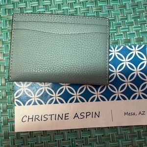 This is a Coach Flat Card Case in Aquamarine pebbled leather with silver hardware. New, never used, no tags. Features two card slots on the front, two on the back, and a center compartment for cards. Measures 4" x 3".