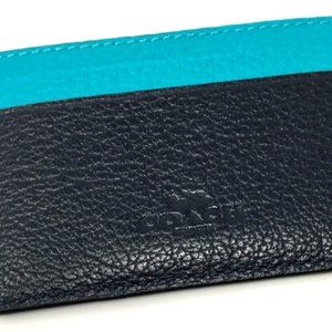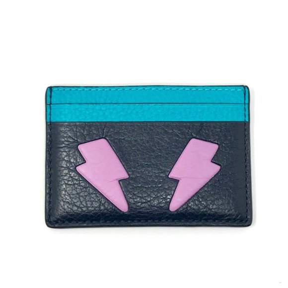 Black pebbled leather card case, with blue leather and lavender lightning bolts.