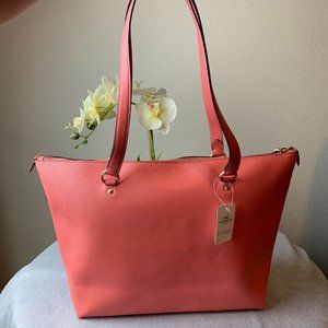 Details: inside zip, cell phone and multifunction pockets| Zip-top closure, fabric lining| | Outside zip pocket| Handles with 10 1/4" drop