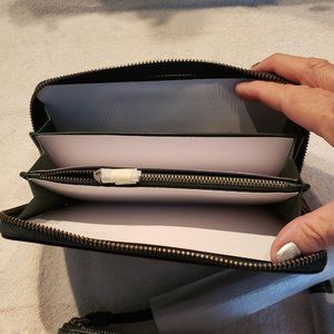 This is a brand new set. All original packaging. Set includes Gallery tote, zip around wallet and wristlet. The wallet and tote have the Horse and Carriage Logo embossed on front. Tote has 10 inch strap drop. Wristlet is 6 x 4 and wallet is the standard 12 cc slot with several inside pockets as well as a middle zip coin compartment, measures 7.5 x 4. Forest Green in color.