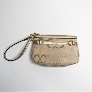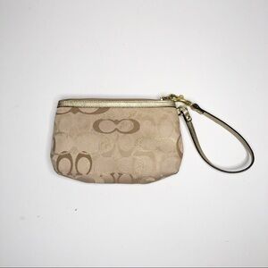 Preloved COACH | Gold Signature Mini Wallet Wristlet. In good condition. NOTE: This wristlet has a few light stains on the exterior. I haven't tried to clean but appears to easily removable with a light wash. See photos for details.
